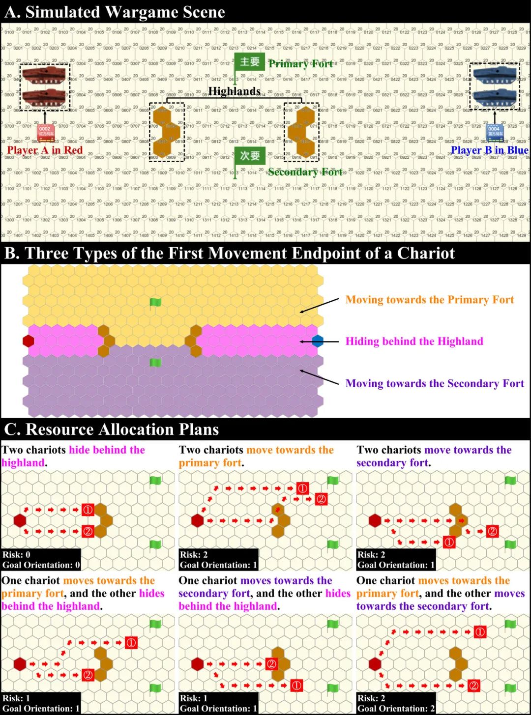 A)兵棋博弈场景。B)战车第一次移动的终点位置的三种类型。C)资源分配策略,“风险性”标签表示是否有战车在高地后掩藏,“0”表示两辆战车均在高地后掩藏,“1”表示仅一辆战车在高地后掩藏,“2”表示两辆战车均不在高地后掩藏;“目标导向性”表示算子是否偏向夺控点,“0”表示均不偏向夺控点,“1”表示仅偏向一个夺控点,“2”表示偏向两个夺控点。