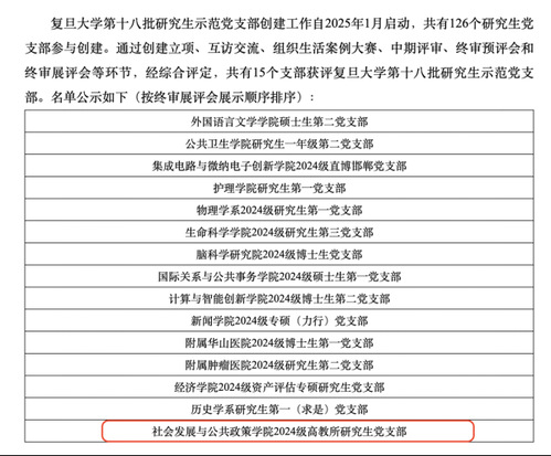 近日,复旦大学第十八批研究生示范党支部创建终审结果正式揭晓。学院2024级高教所研究生党支部凭借扎实的组织建设、鲜明的育人特色、突出的实践成效和广泛的示范影响,成功获评复旦大学第十八批研究生示范党支部。
