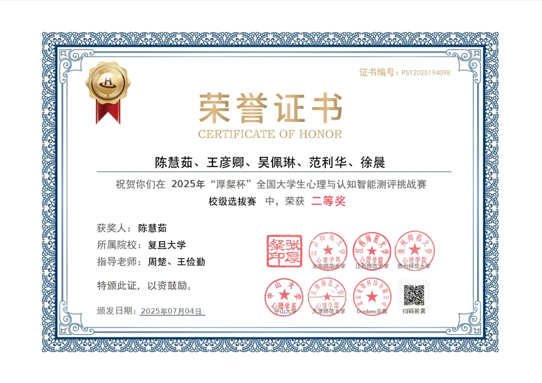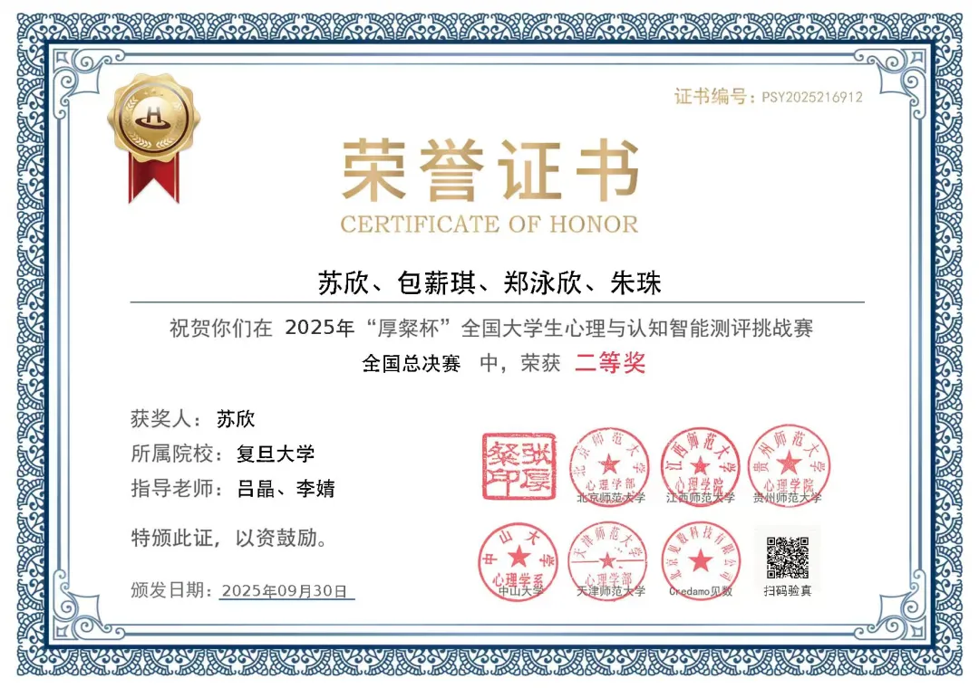 近日,首届“厚粲杯”全国大学生心理与认知智能测评挑战赛在北京师范大学顺利落幕。我院心理学系组织的两支参赛队伍表现优异。由我院心理学研究生苏欣、包薪琪、郑泳欣、朱珠组成的比赛队伍,在吕晶副研究员、李婧副研究员的指导下,荣获了全国总决赛二等奖!由我院心理学本科生陈慧茹、王彦卿、吴佩琳、范利华、徐晨组成的比赛队伍,在周楚教授、王俭勤副教授的指导下,荣获了校级选拔赛二等奖!同时,吕晶老师、李婧教师获评了优秀指导教师奖,充分展现了我院在心理学与认知智能领域的教学实力与学生创新实践能力。